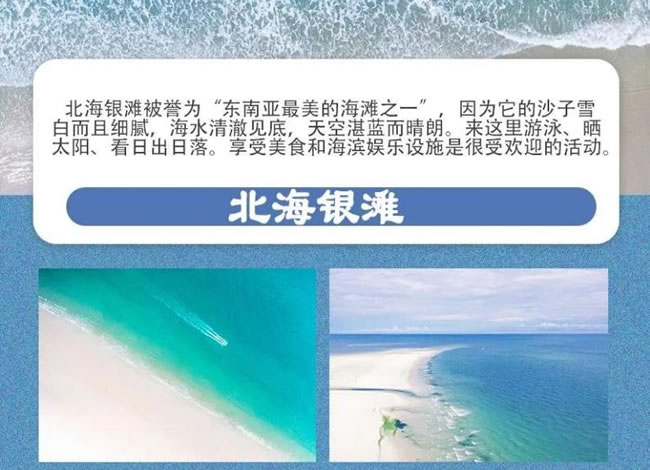 北海銀灘被譽為“東南亞最美的海灘之一 ”因為它的沙子雪白而且細膩,海水清 澈見底,天空湛藍而晴朗。來這里游泳、曬太陽、看日出日落。享受美食和海濱 娛樂設(shè)施是很受歡迎的活動