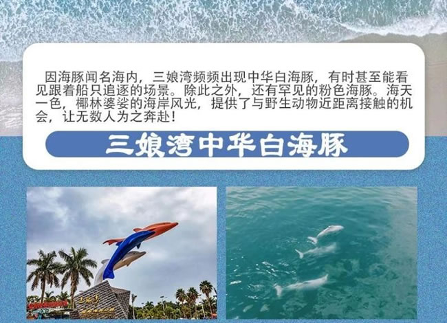 因海豚聞名海內(nèi),三娘灣頻頻出現(xiàn)中華白海豚,有時甚至能看見跟著船只追逐的 場景。除此之外,還有罕見的粉色海豚。海天椰林婆娑的海岸風(fēng)光,提供了與野 生動物近距離接觸的機 ·備讓無數(shù)人為之奔赴!